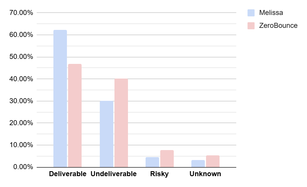 For this comparison, we grouped Melissa and ZeroBounce’s results into 4 different categories: Deliverable, Undeliverable, Risky, and Unknown.